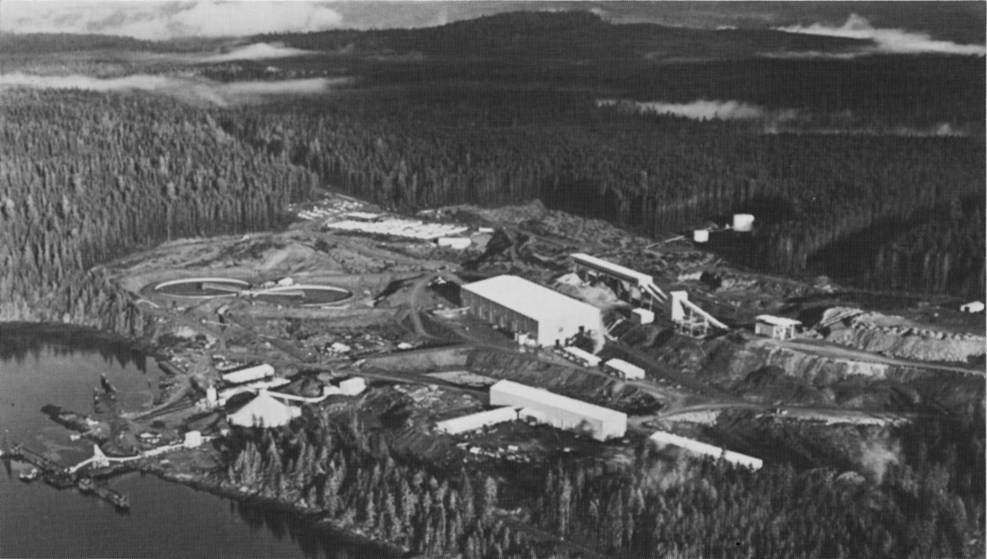 $50 million, grassroots mine and copper/molybdenum ore concentrator, Canada’s second largest at the time. The 280 million-ton reserve of copper/molybdenum ore is processed at 33,000 tons-per-day, yielding 230,000 tons-per-year copper and 1,800 tons-per-year molybdenum concentrates. The total gravity submarine tailings disposal system is a unique departure in tailings handling, designed to comply with ecology-responsible regulations. Ore from the open-pit mine is loaded into 120-200 ton haul trucks by electric shovels, followed by gyratory crushing, screening, coarse and fine ore storage, autogenous grinding, cyclone separation, floation, thickening, disc filtering, drying, storage and ship loading plus other ancillary facilities including a 600-man construction camp.
